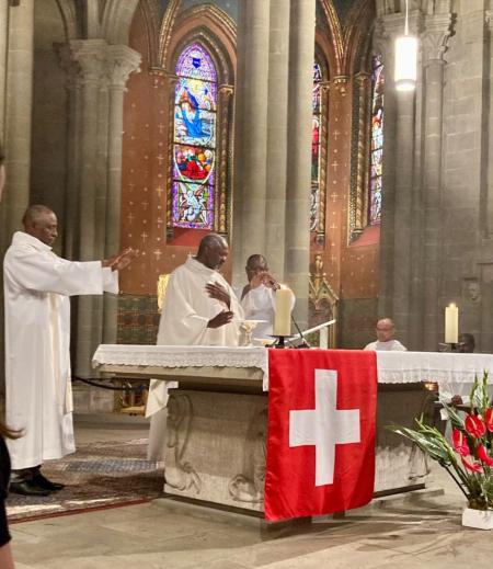 Les Pères Faustin et Richard concélèbrent avec le Père Côme qui préside