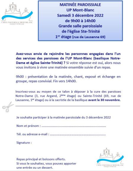Inscription obligatoire jusqu'au 30 novembre au moyen du bulletin à votre disposition à la basilique et à l'église Ste-Trinité ou en contactant la cure Notre-Dame au 022 716 56 66.