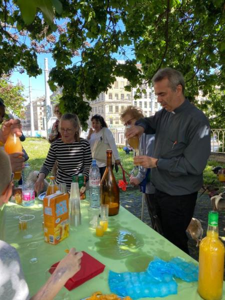 L'abbé Desthieux en compagnie de Sylvie Goanec, présidente du Conseil de Communauté de Notre-Dame préparent l'apéritif qui a suivi la bénédiction.