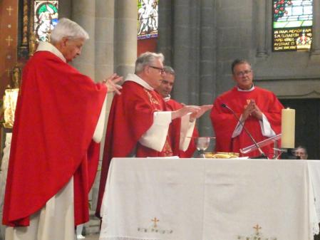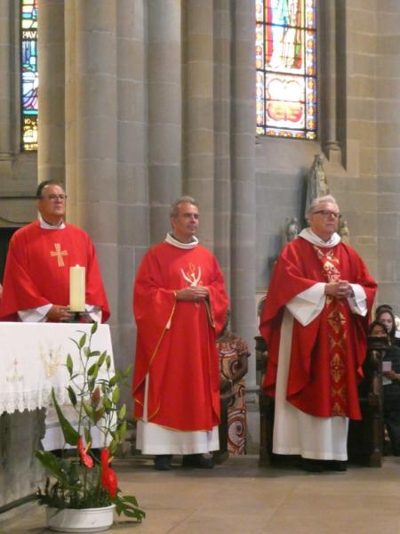Messe concélébrée par l'abbé Pascal Gobet, Mgr Bernard Sonney qui préside, les abbés Pascal Desthieux et Jean-Luc Martin