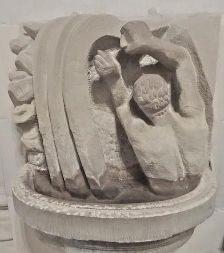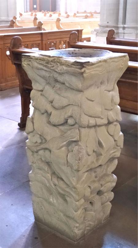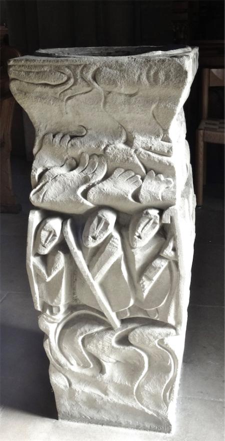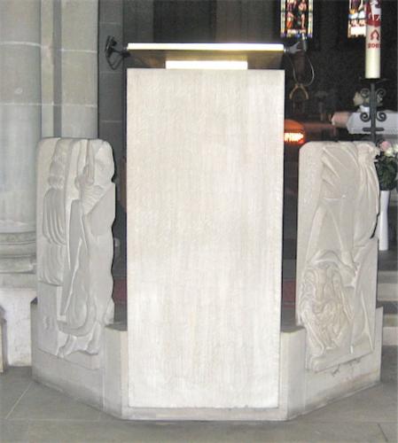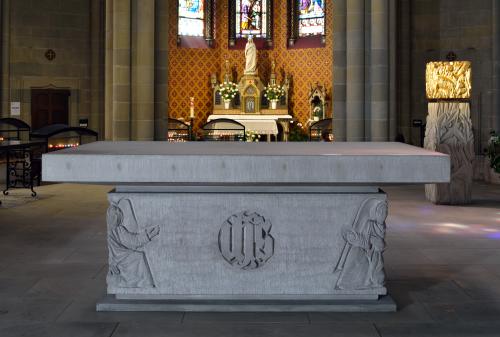 Suite aux directives de Vatican II et après une série d’essais de divers autels provisoires, il est revenu à Monsieur Jean-Michel Bouchardy, un artiste genevois, de concevoir le nouveau mobilier liturgique qui a été ensuite réalisé par le sculpteur Dominique Bovy, genevois lui aussi. Tout est en grès des Vosges et est réalisé de 1983 à 1986.